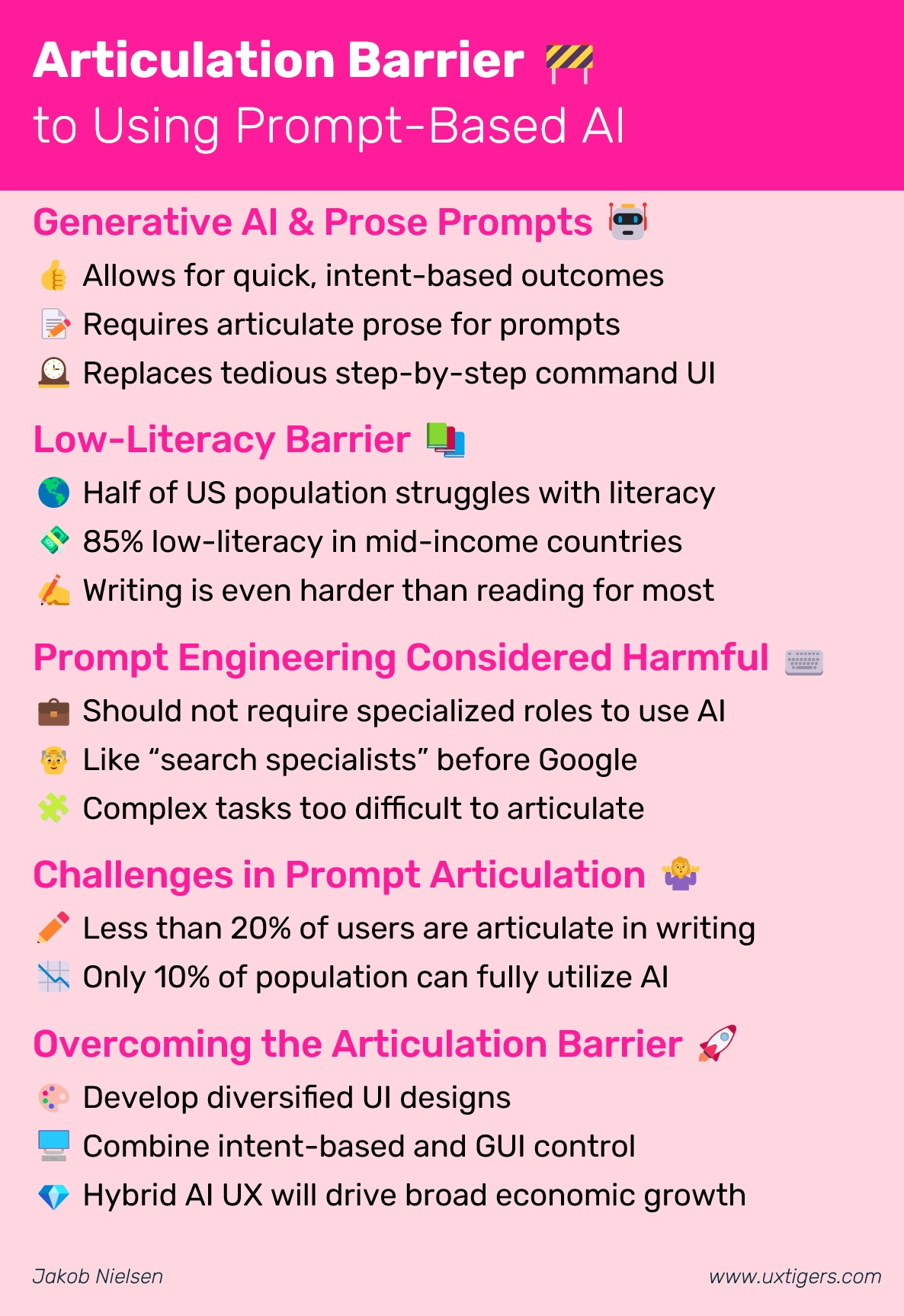 但一个主要的可用性缺点是,用户必须具有高度表达能力才能为提示编写所需的散文文本。根据最新的读写能力研究(详见下文),像美国和德国这样的富裕国家中,一半的人口被分类为低读写能力的用户。(虽然日本和可能的一些其他亚洲国家的情况要好一些,但在中等收入国家的情况要糟糕得多,而在发展中国家可能更糟。)